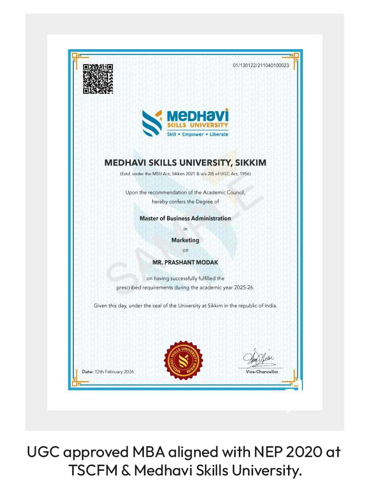 At TSCFM, you have an option to choose from 4 different custom built specializations in the area of your interest. This UGC Recognized MBA transforms your career, gives you advanced knowledge and practical exposure in your specialized stream